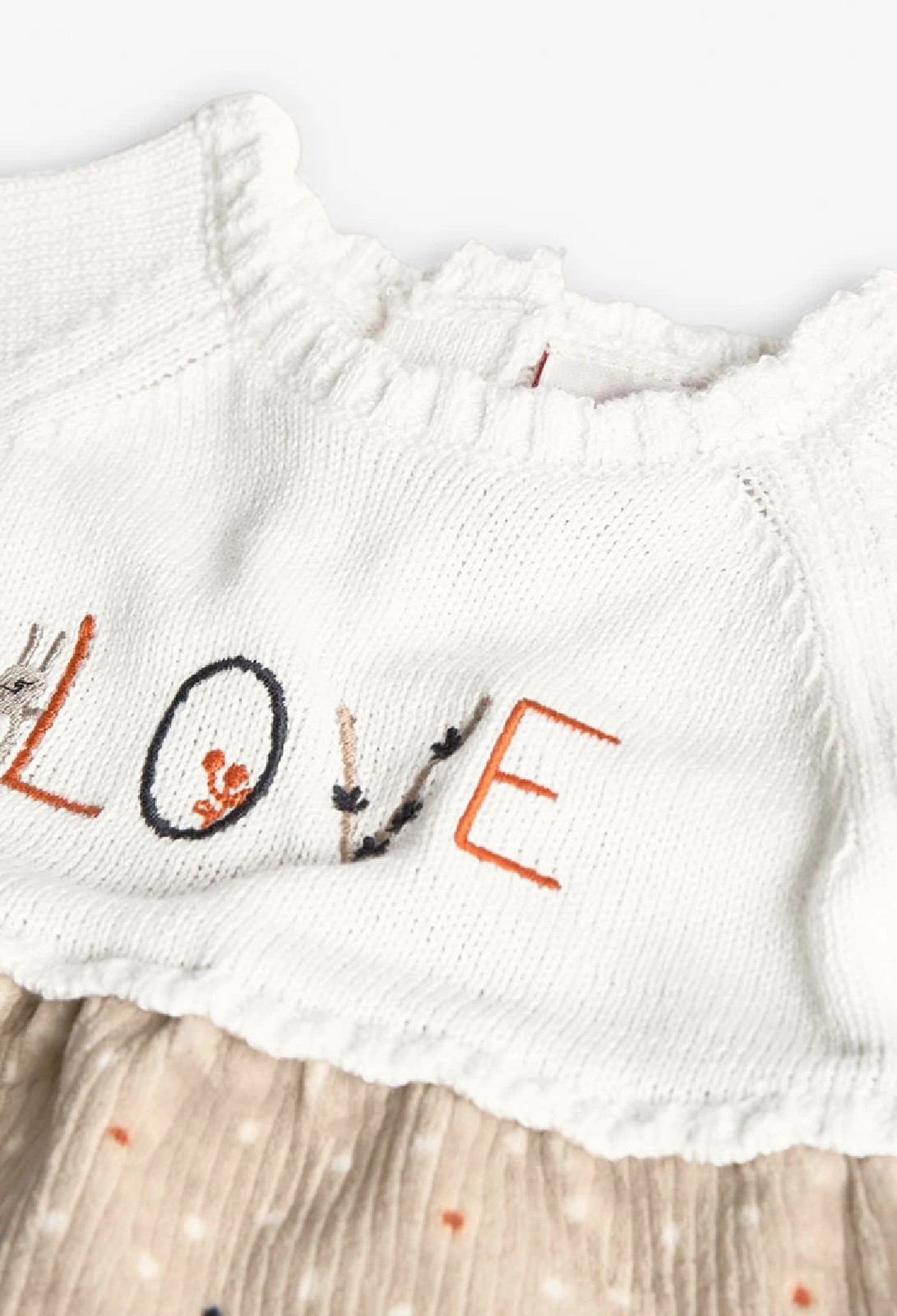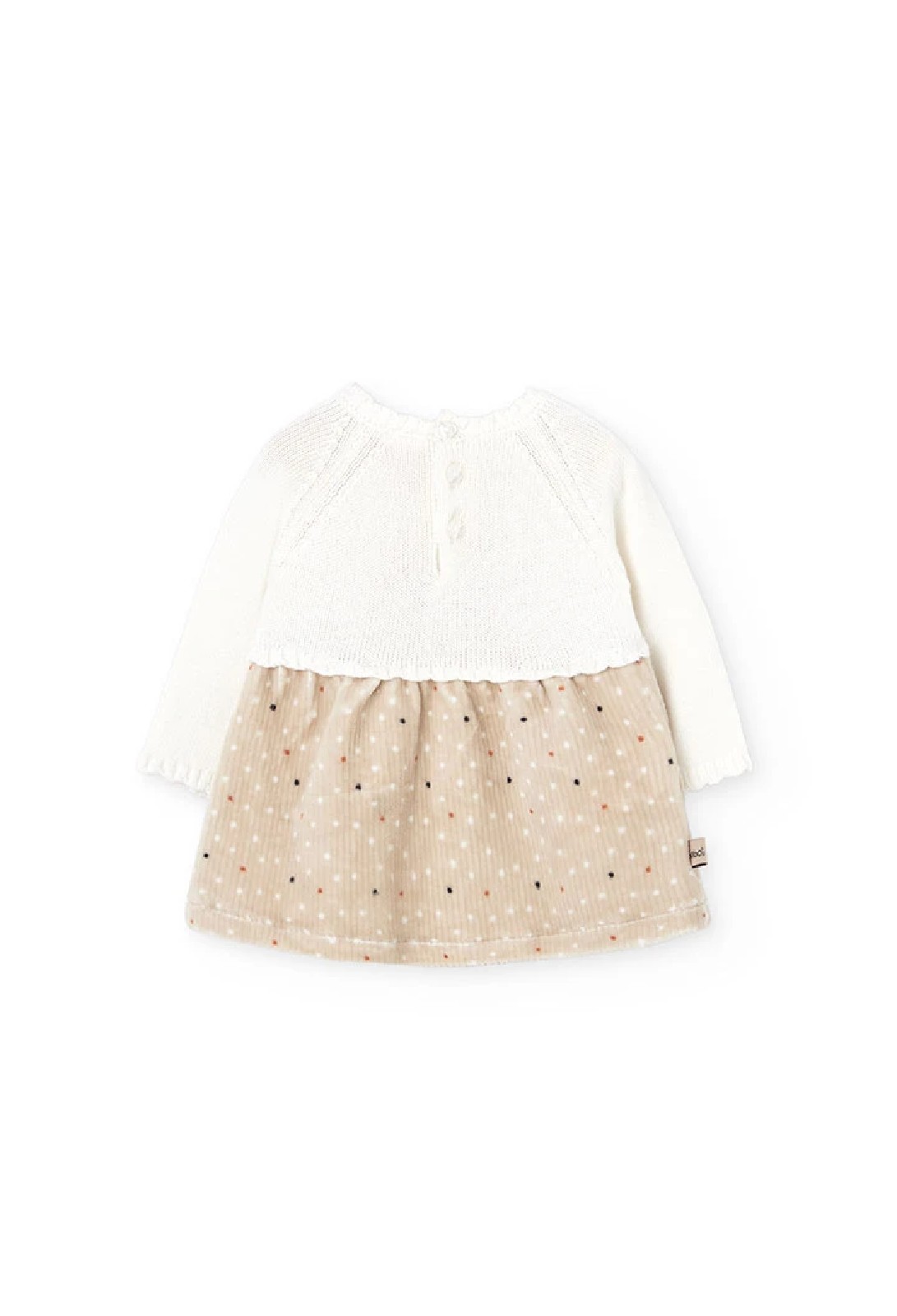 Vestito per bebè in colore crema è ideale per la stagione autunnale e invernale grazie alla sua realizzazione in tessuto morbido e caldo. Presenta un corpo in maglia in tonalità crema e una gonna con pois a contrasto che aggiungono un tocco giocoso, rendendo questo capo una scelta incantevole per eventi speciali o per l’uso quotidiano. Progettato per bebè da 1 mese a 2 anni, questo vestito a maniche lunghe difre grande comfort durante i giorni freddi. Il capo è versatile e può essere facilmente abbinato a calze o collant in tonalità neutre per completare un abbigliamento adorabile e accogl