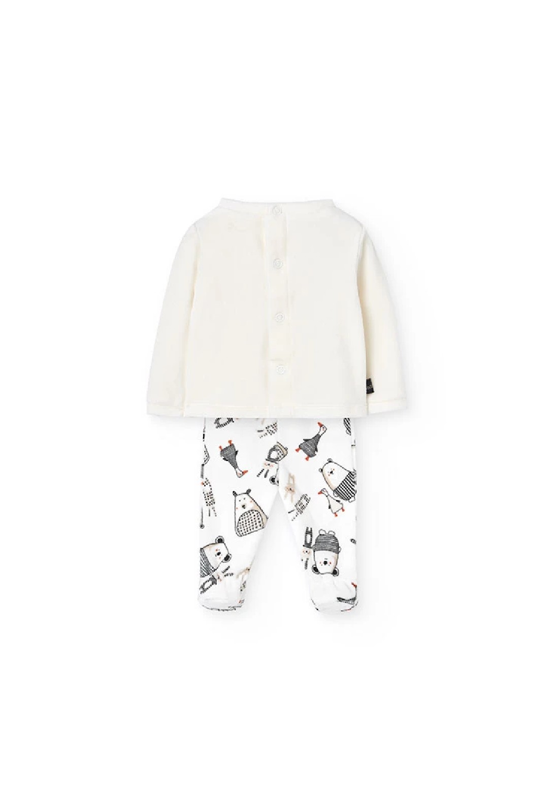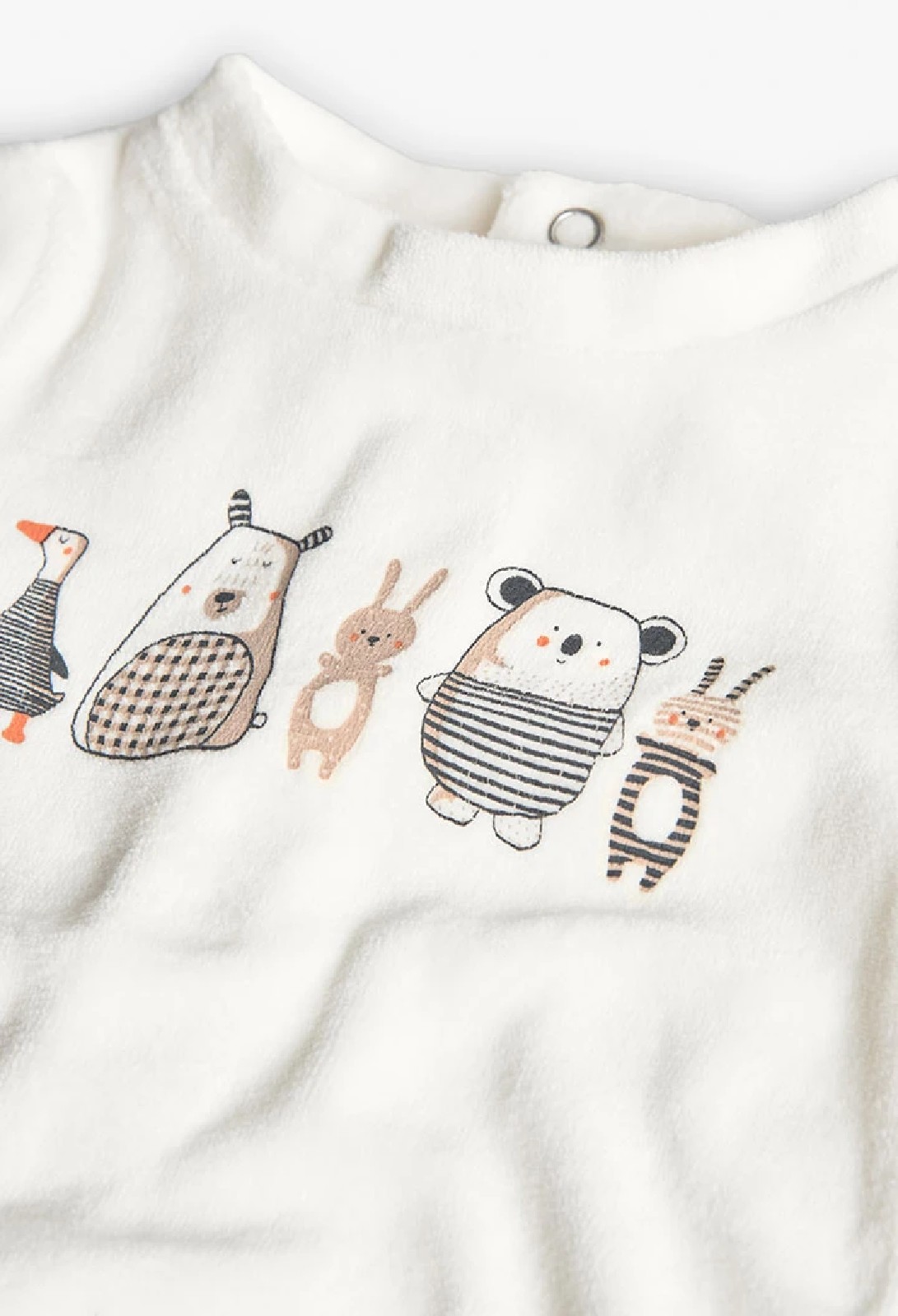 Set di velluto per neonato con stampa di animali, ideale per mantenere il tuo piccolo caldo e comodo nei giorni più freddi. Composto da una giacca e pantaloni, entrambi realizzati con un velluto morbido e caldo che cura la pelle sensibile del neonato. I motivi di animali in toni neutri aggiungono un tocco divertente e adorabile al set. Disponibile in taglie da 0 a 6 mesi, garantendo una vestibilità perfetta man mano che il tuo neonato cresce. Perfetto da abbinare a magliette di base o body, questo set è un’opzione pratica e stilosa per l’uso quotidiano in autun