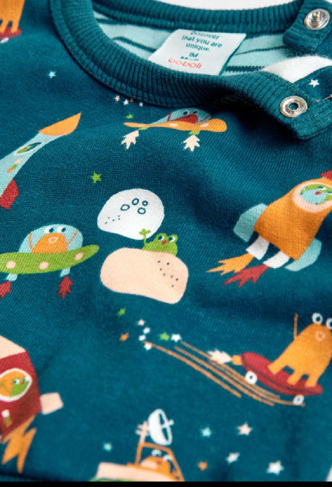 Set tuta e pantaloni per neonato maschio. La felpa è di colore blu con stampa di motivi dell’universo e razzi in vari colori. Si chiude su una spalla con bottoni a pressione. Ha un’etichetta con dettagli del marchio. Il pantalone di felpa blu ha una stampa di un razzo in diversi colori. Si adatta con elastico in vita e cordino di colore turchese. Disponibile dalla taglia 3 mesi ai 2 anni.