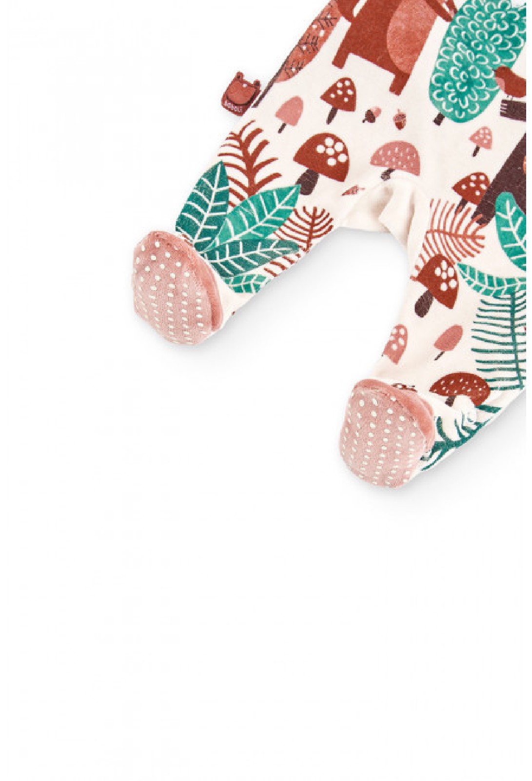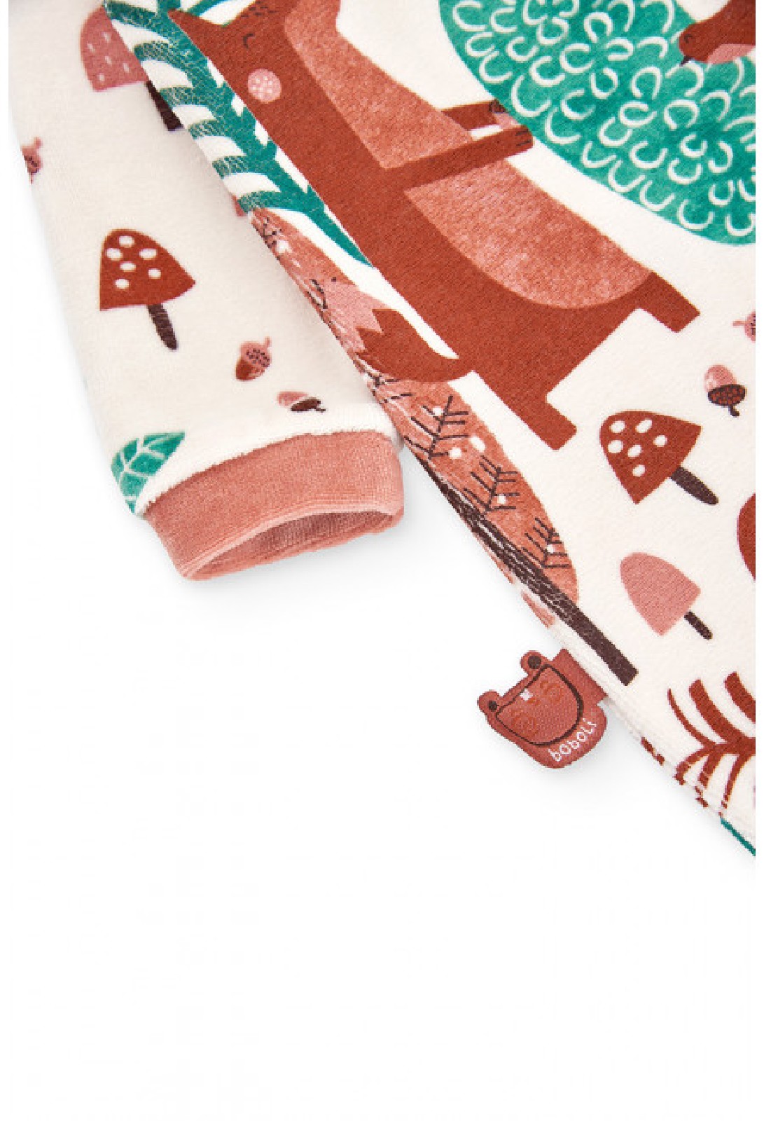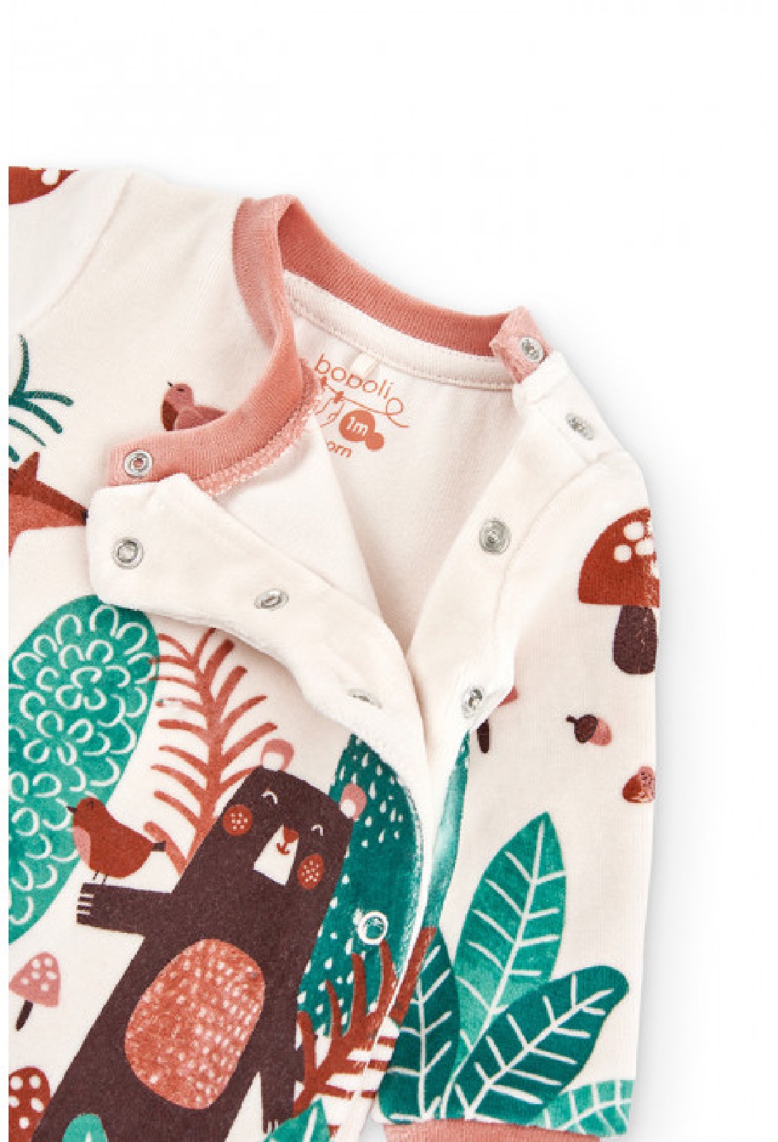 Pagliaccetto da neonato unisex in velluto in color écru con una stampa di un bosco con animali in diversi colori. Si chiude su un lato con bottoni a pressione. Ha etichetta con dettaglio del brand. Disponibile dalla taglia 0 mesi a 2 anni.composizione:83%cotone 17%elastan