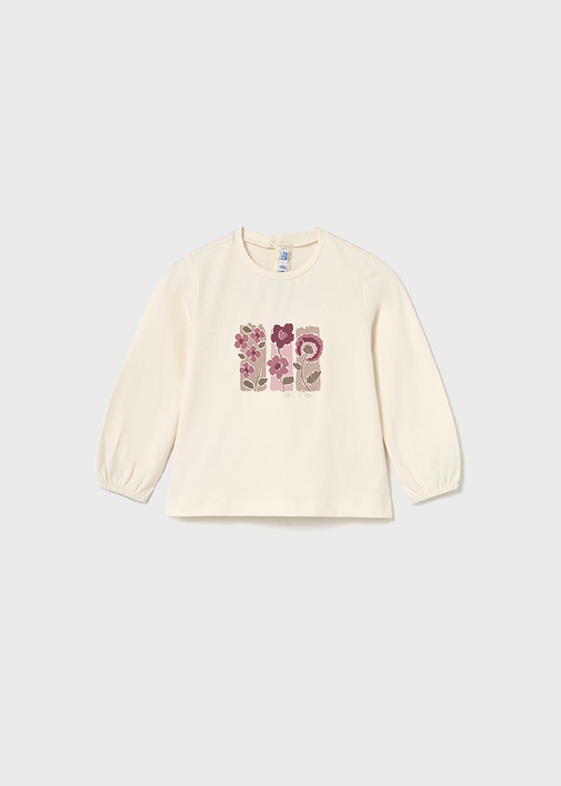 Maglietta manica lunga per neonata con polsini elasticizzati. Girocollo. Chiusura con bottoni a pressione nella parte posteriore. Elementi decorativi: Serigrafia (print)