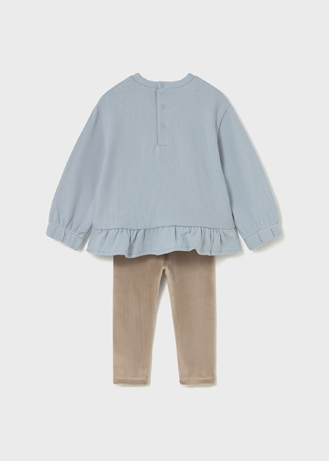 Felpa manica lunga per neonata con polsini elasticizzati. Girocollo. Chiusura con bottoni a pressione nella parte posteriore. Modello con riccio e volant. Elementi decorativi: applicazioni decorative, ricami Pantalone modello leggings per neonata. Elastico in vita. Design liscio.