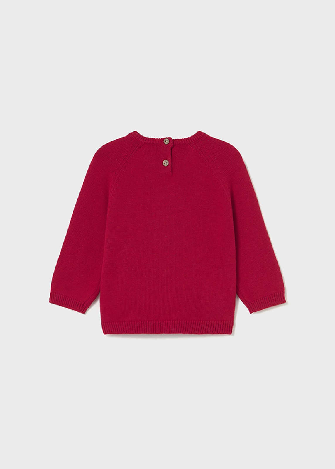 Contiene poliammide riciclato. Maglione manica raglan per bebé. Girocollo. Chiusura con bottoni sulla schiena per facilitare la vestibilità del capo. Elementi decorativi: ricami nella parte anteriore.