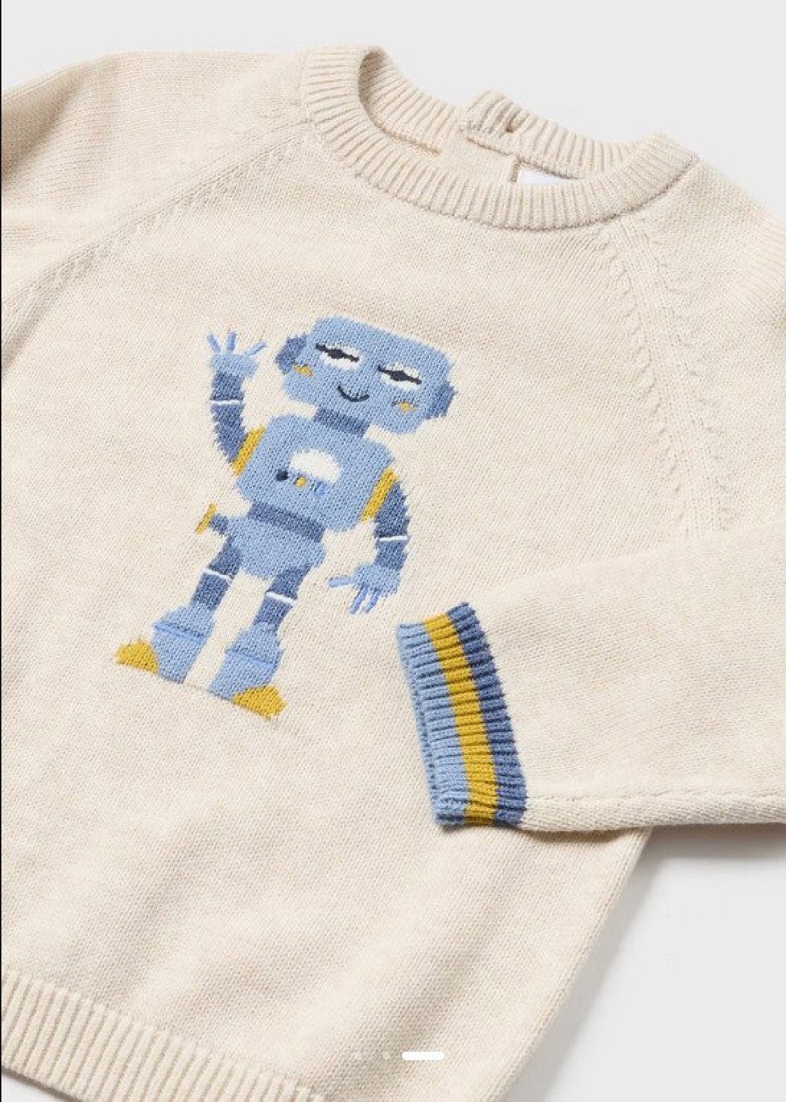 Maglioncino girocollo panna con robot ricamato nella parte anteriore. Scorri la pagina verso il basso per scoprire i prodotti abbinati.