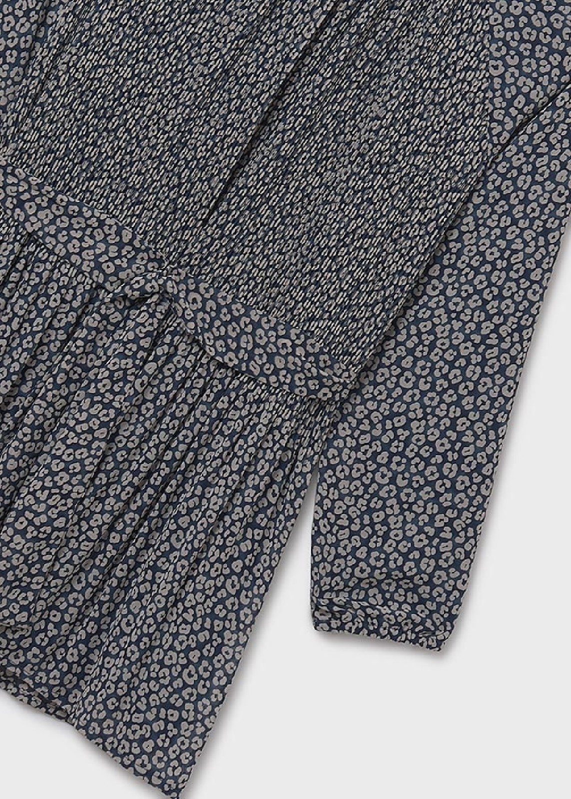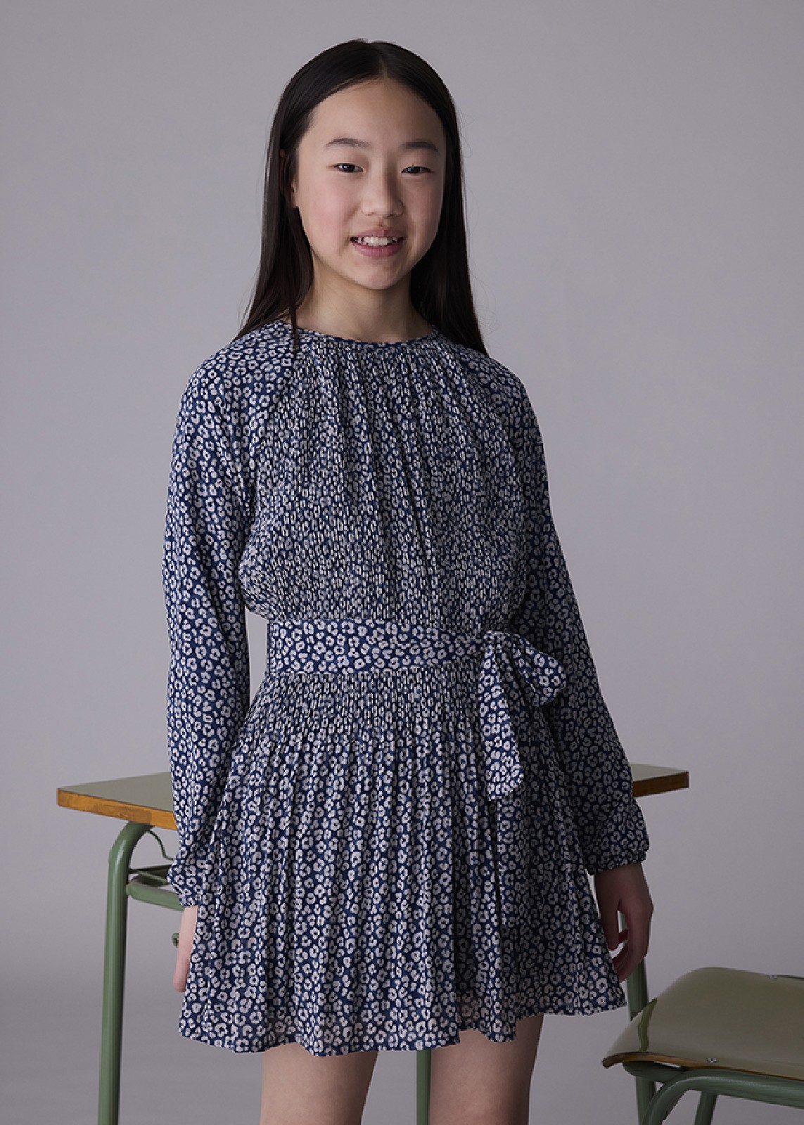 Vestito manica lunga per ragazza con polsini elasticizzati. Girocollo. Piccola apertura sulla schiena con chiusura con bottone per facilitare la vestibilità del capo. Modello dal design plissettato. Design stampato.