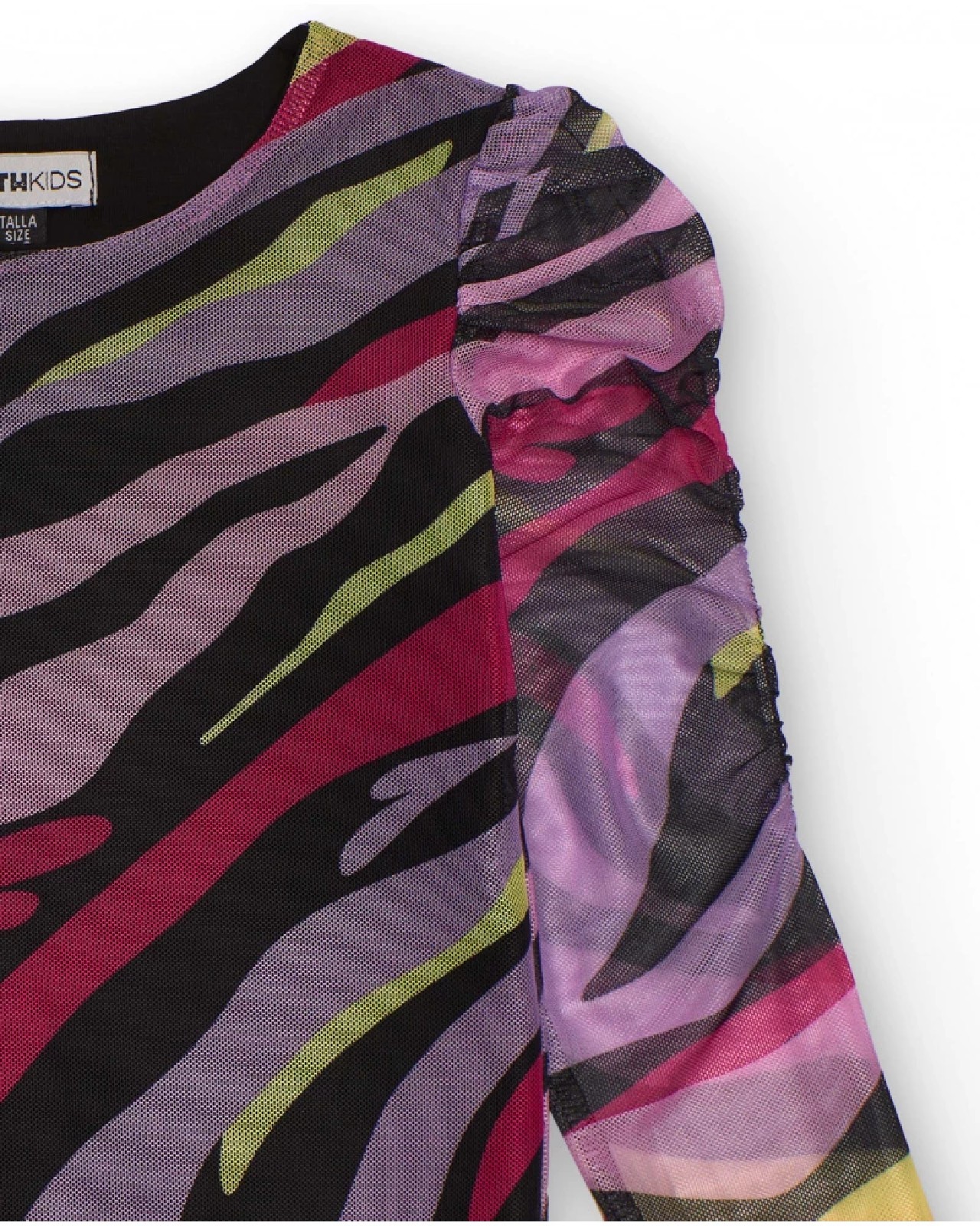 Maglietta a maniche lunghe per bambina realizzata in tulle semitrasparente con una vivace stampa multicolore ispirata all’animalier. Presenta scollo rotondo, arricciature decorative sulle spalle e vestibilità aderente. Un capo originale e leggero, perfetto per outfit moderni e pieni di carattere.