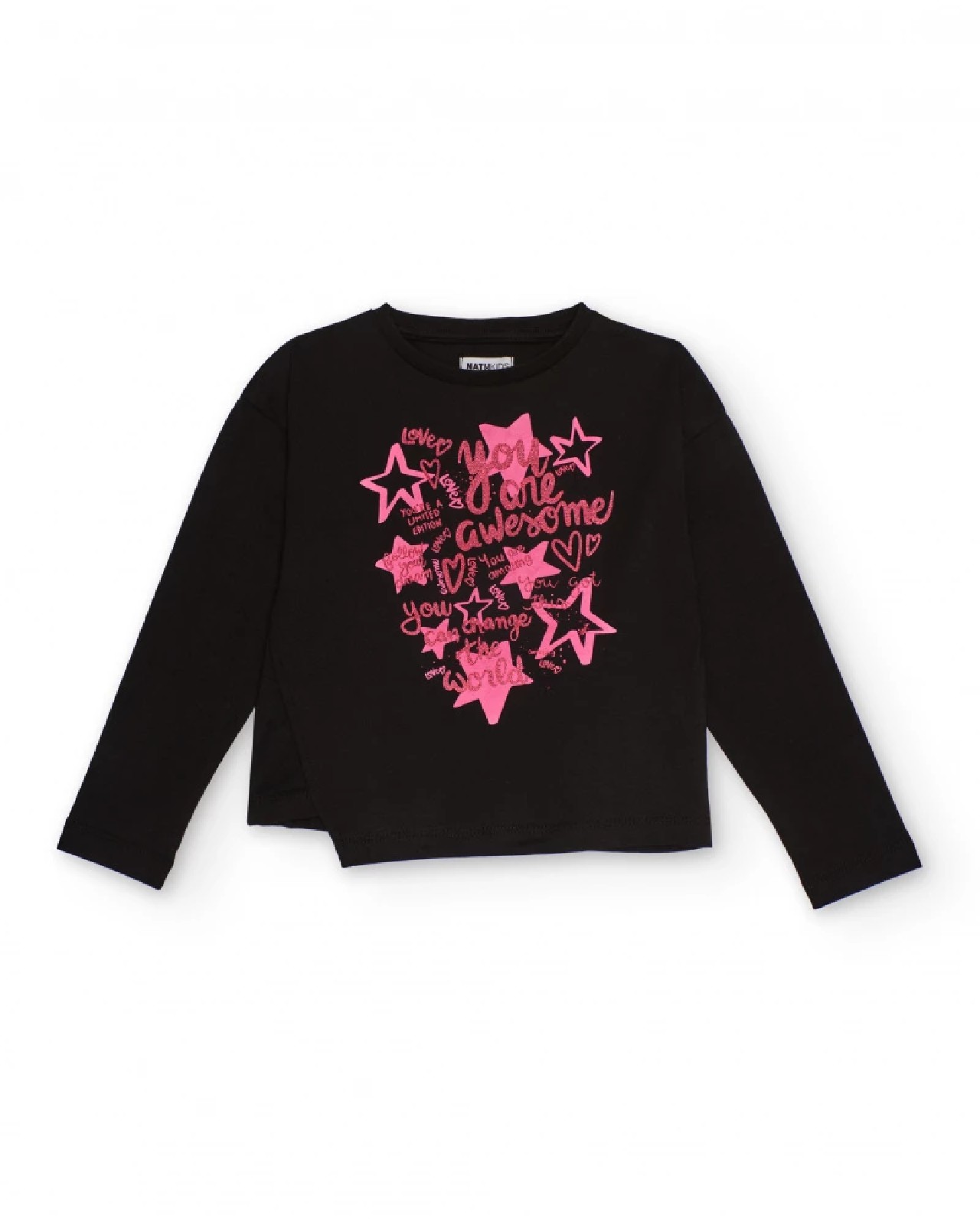 Maglietta a maniche lunghe per bambina in colore nero, con orlo asimmetrico e stampa frontale in rosa brillante. La stampa presenta stelle, cuori e messaggi positivi che donano un tocco divertente e motivazionale. Realizzata in tessuto morbido e confortevole, è perfetta per outfit quotidiani pieni di personalità.