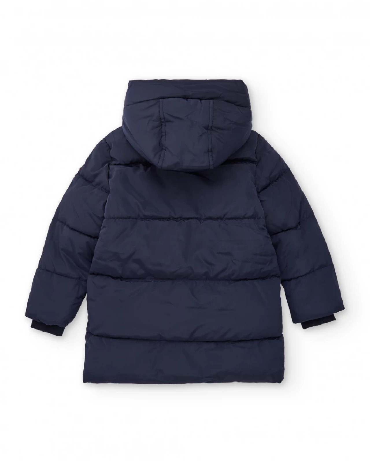 Piumino imbottito per bambino in blu navy. Con cappuccio fisso, chiusura frontale con zip e patta con bottoni a pressione. Dotato di tasche con patta e bottoni e taschino con zip sul petto, pratici e funzionali. Polsini con finitura elastica per maggiore comfort. Un capo caldo e resistente, ideale per l’uso quotidiano nei mesi freddi.