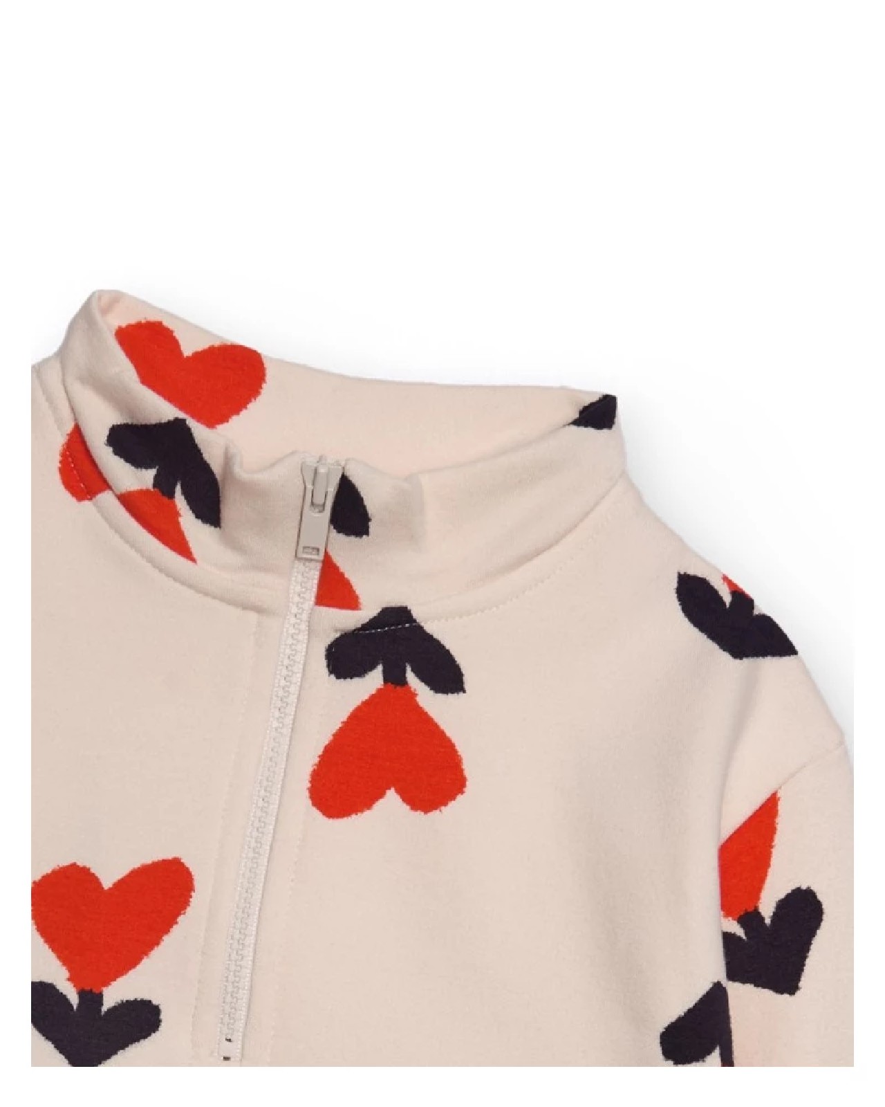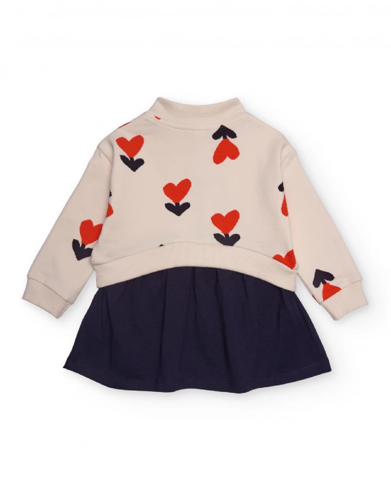 Vestito per bambina dal design combinato, con corpetto in felpa color écru e gonna blu navy. Decorato con una stampa di cuori colorati e chiusura frontale con zip. Realizzato in tessuto morbido ed elastico per un maggiore comfort.