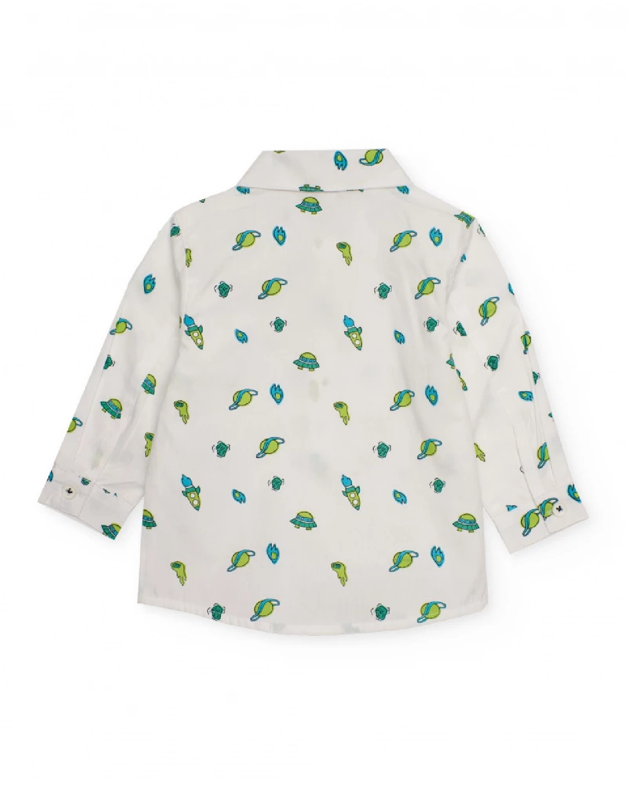Camicia a maniche lunghe per bambino di colore bianco, realizzata in tessuto leggero e morbido al tatto. Presenta una simpatica stampa a tema spaziale con razzi, pianeti e UFO nei toni del verde e del blu. Ha un piccolo ricamo di razzo sulla tasca frontale. Il design include colletto classico e chiusura frontale con bottoni, perfetta sia per occasioni casual che più eleganti. Ideale per aggiungere un tocco originale e moderno al guardaroba dei più piccoli.