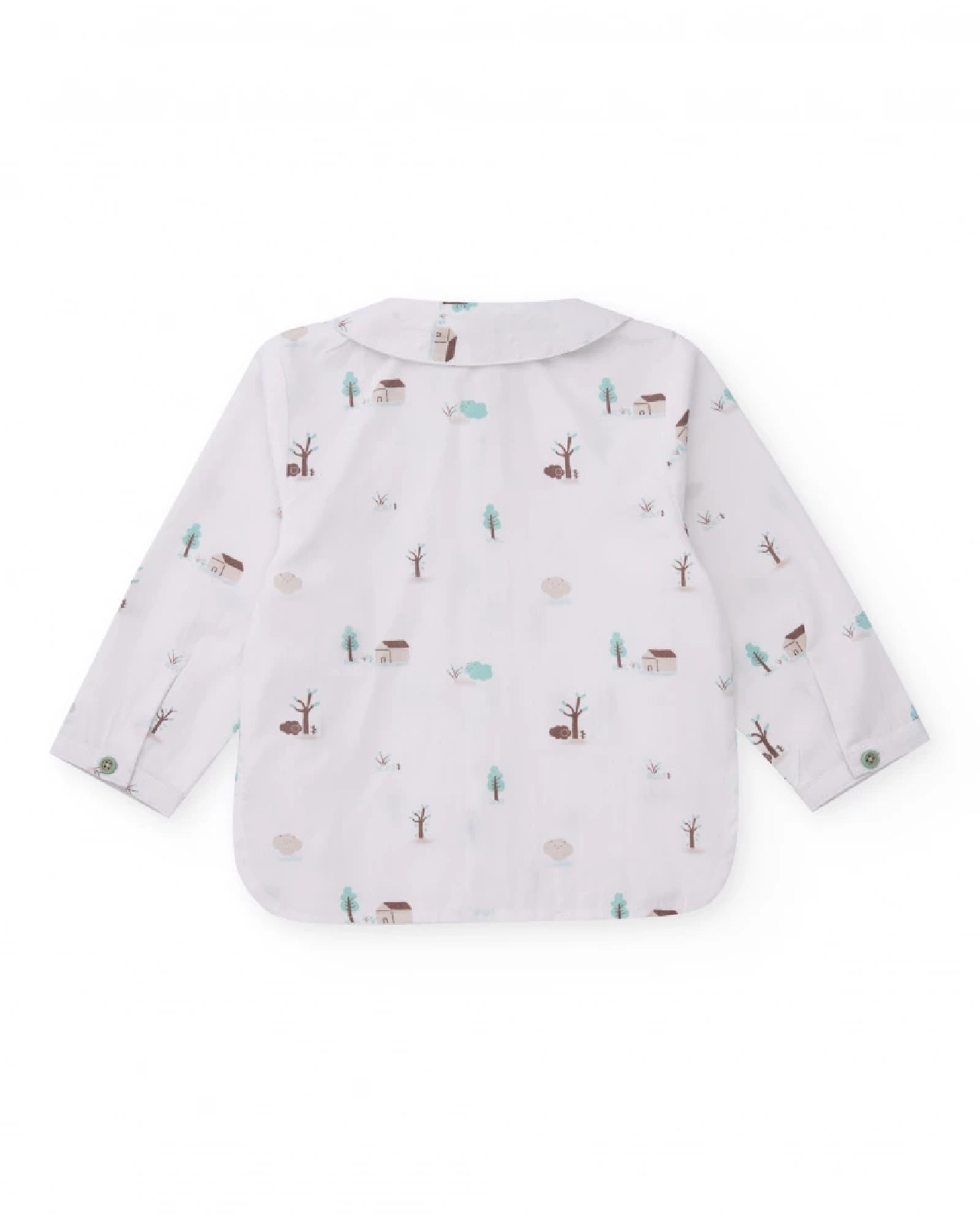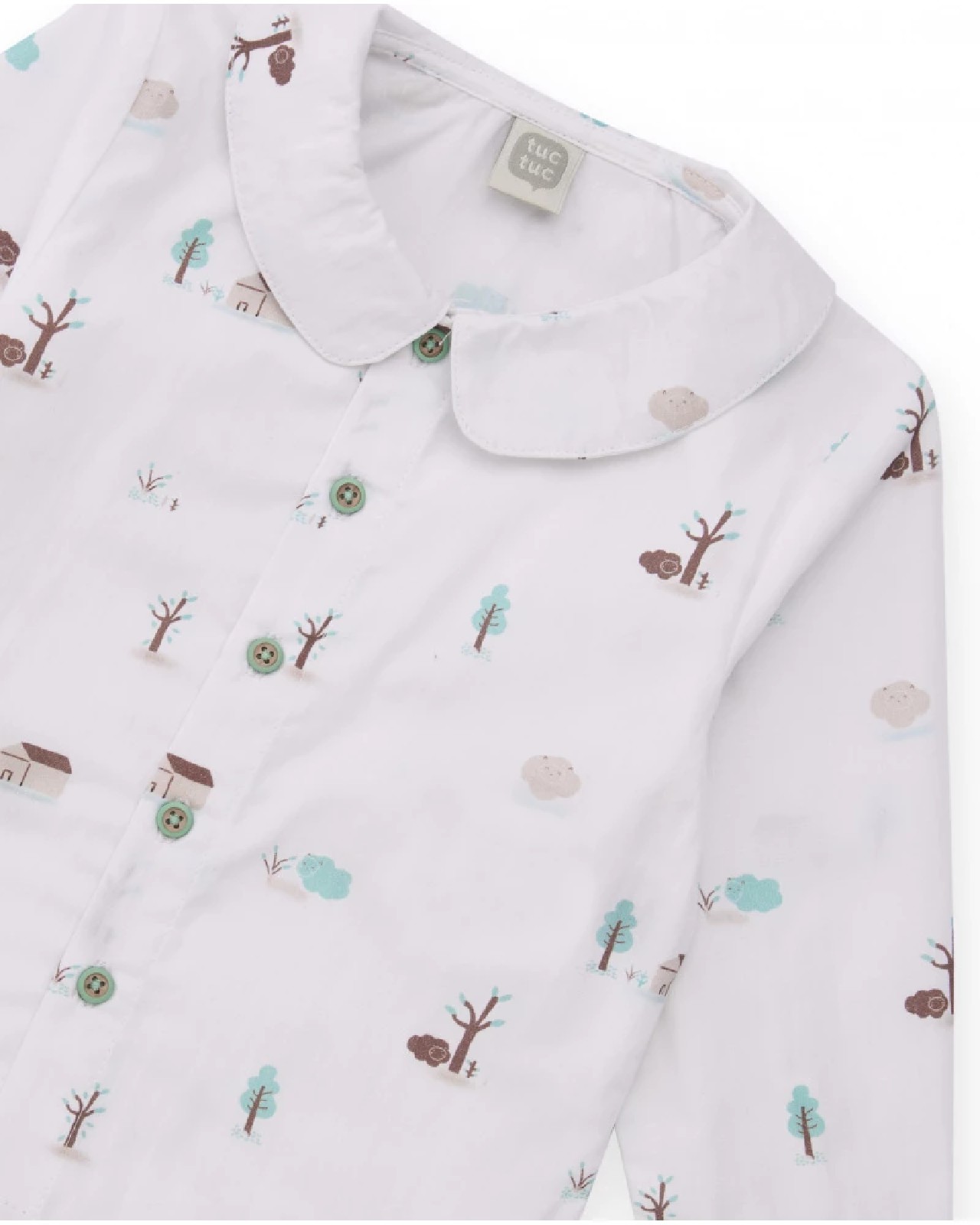 Completo per bambino composto da camicia bianca a manica lunga con delicata stampa di casette e alberi in toni pastello. Colletto classico e chiusura frontale con bottoni tono su tono. Pantaloni marroni con vita elasticizzata e risvolto per un look più casual.