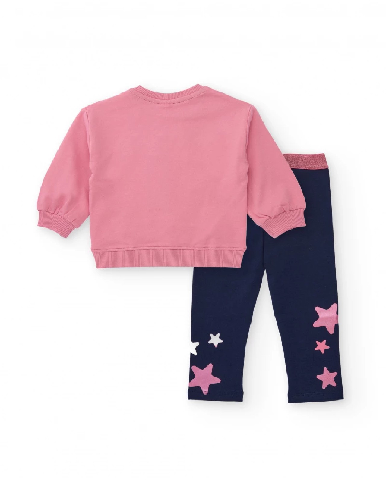 Completo per bambina con felpa rosa con grande stella ricamata in rosa, bianco e blu navy, e piccoli dettagli ricamati. Leggings blu navy con allegra stampa di stelle multicolore. Tessuti morbidi e comodi, perfetti per un look quotidiano stiloso.