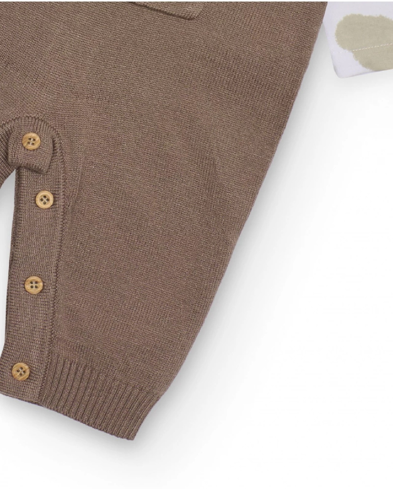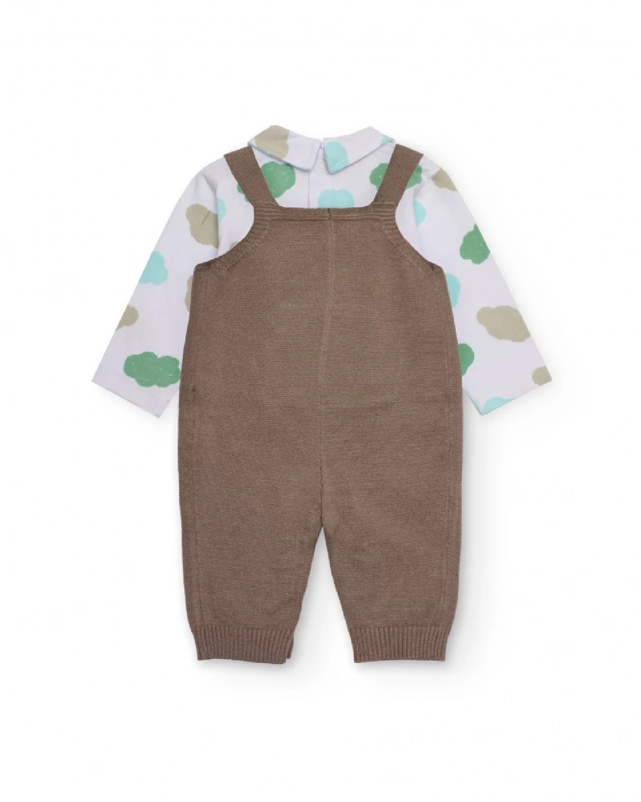 Completo per neonato composto da una salopette in maglia di colore marrone con bretelle con bottoni e tasca centrale tipo marsupio. La maglietta a maniche lunghe bianca è decorata con una deliziosa stampa di nuvolette nei toni verde acqua e beige, e presenta un colletto classico. La salopette è dotata di bottoni sul cavallo per facilitare il cambio del pannolino, difrendo comfort e un look tenero per ogni occasione.