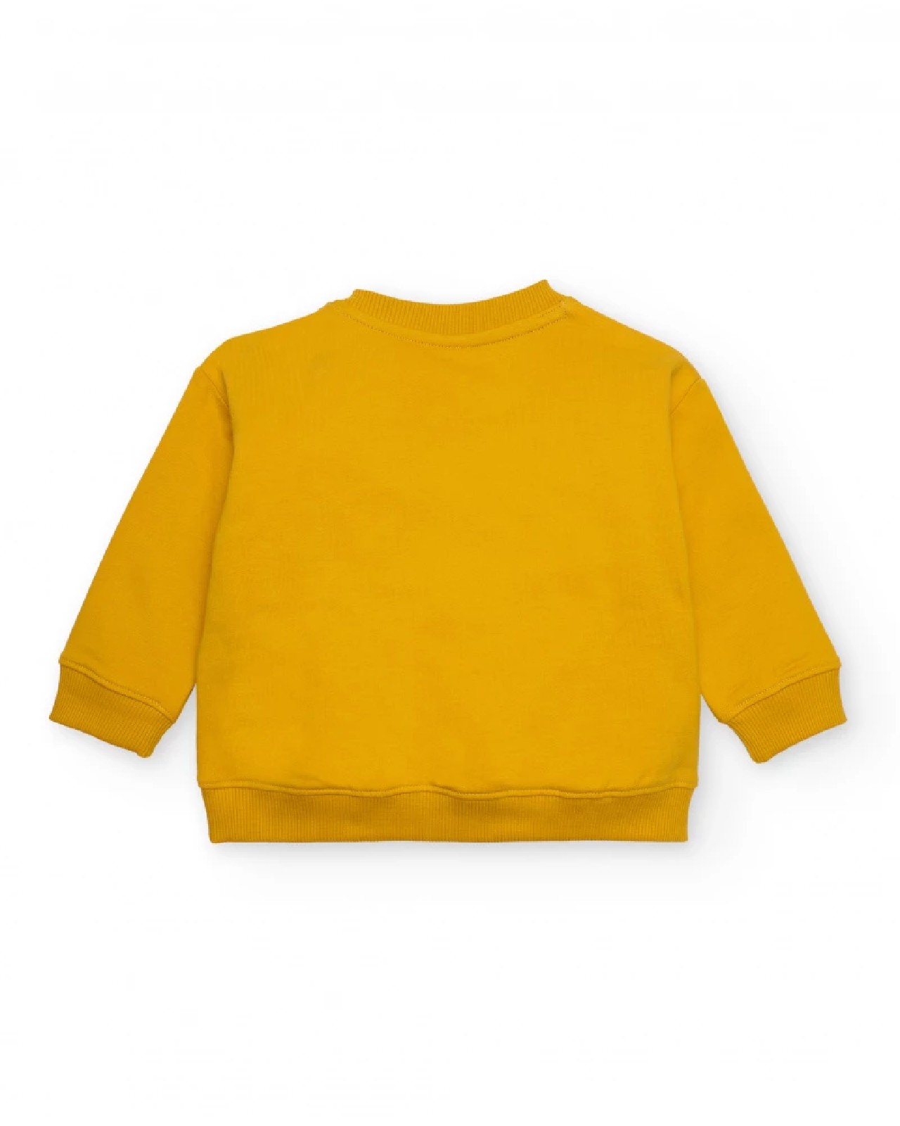 Felpa in pile color senape vivace per bambino con design originale di dinosauro a texture mista e dettagli in rilievo. Collo, polsini e orlo a costine, bottoni automatici sulla spalla.