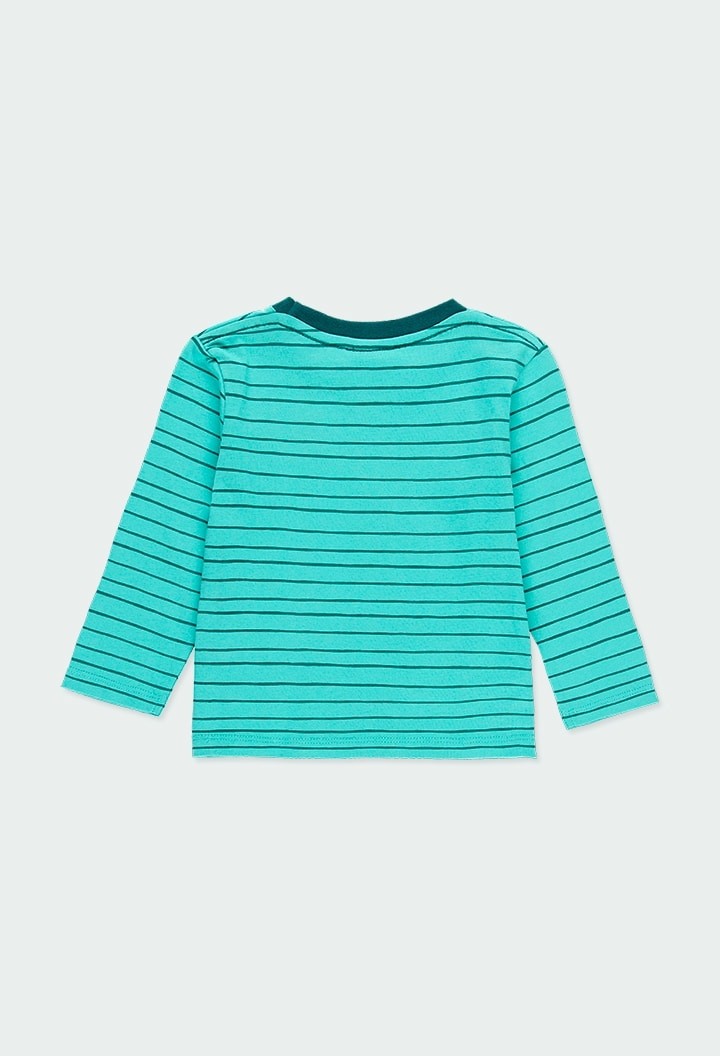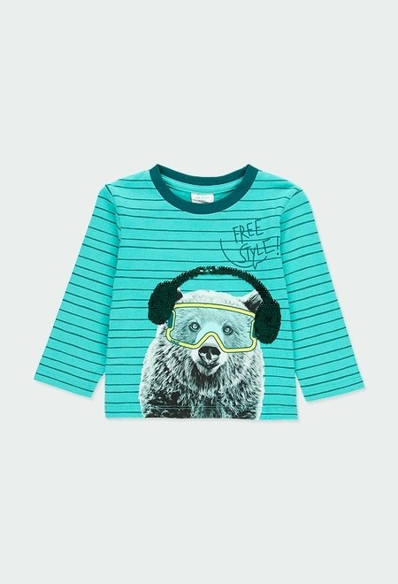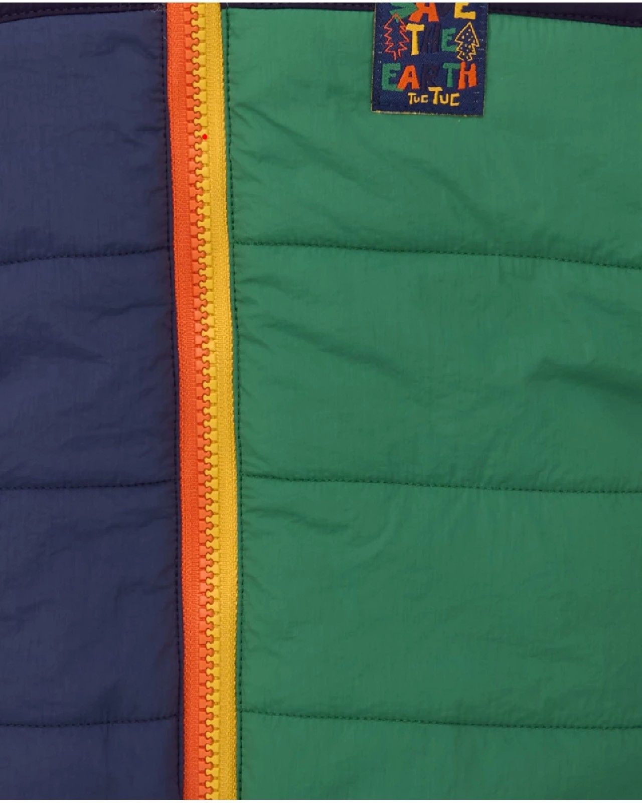Giacca imbottita per bambino a blocchi di verde, blu navy e arancione vivace. Cappuccio fisso foderato in pelliccia sherpa, chiusura a zip gialla e tasche laterali.