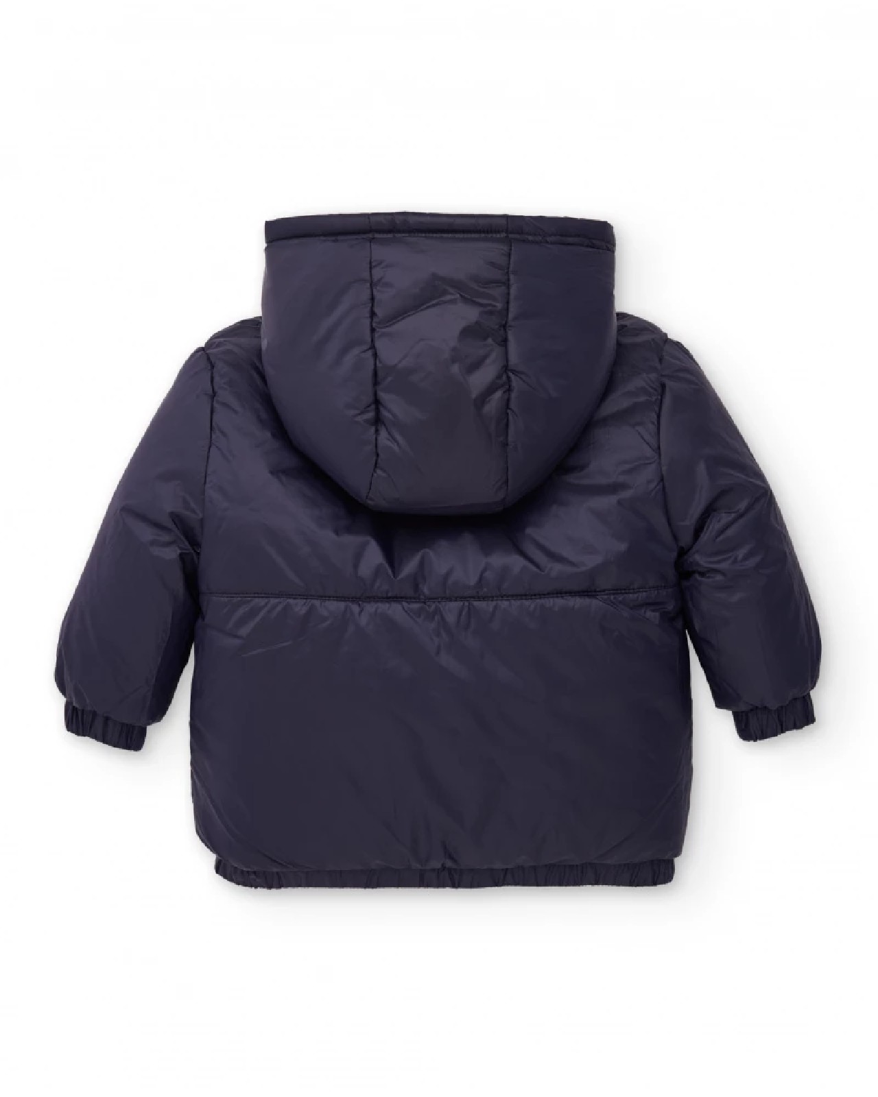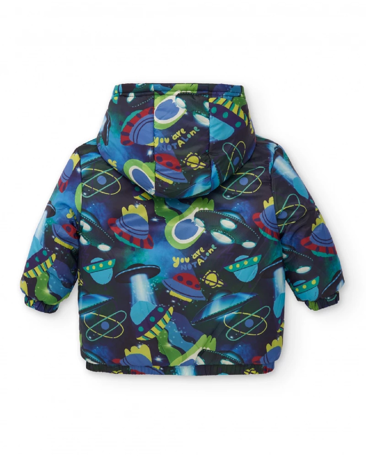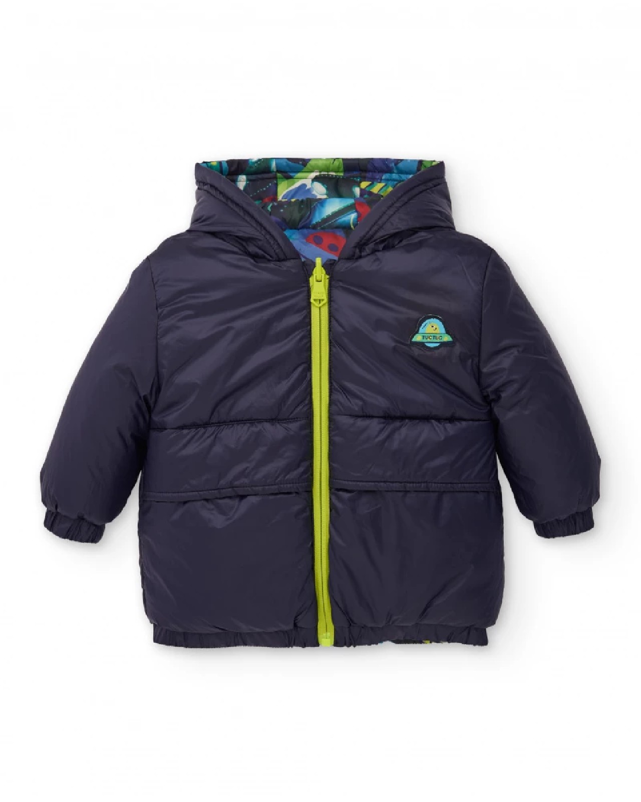 Giacca imbottita reversibile per bambino con una stampa colorata a tema spaziale che dona un tocco divertente e originale, progettata per garantire calore e comfort nei climi freddi. Presenta cappuccio integrato e chiusura frontale in verde neon per un contrasto accattivante. L’interno è foderato in blu navy e i polsini sono elastici per una migliore aderenza e protezione dal vento.