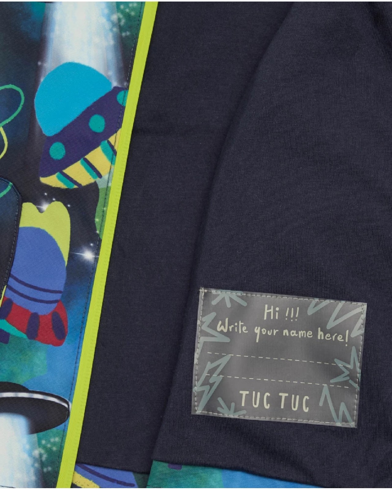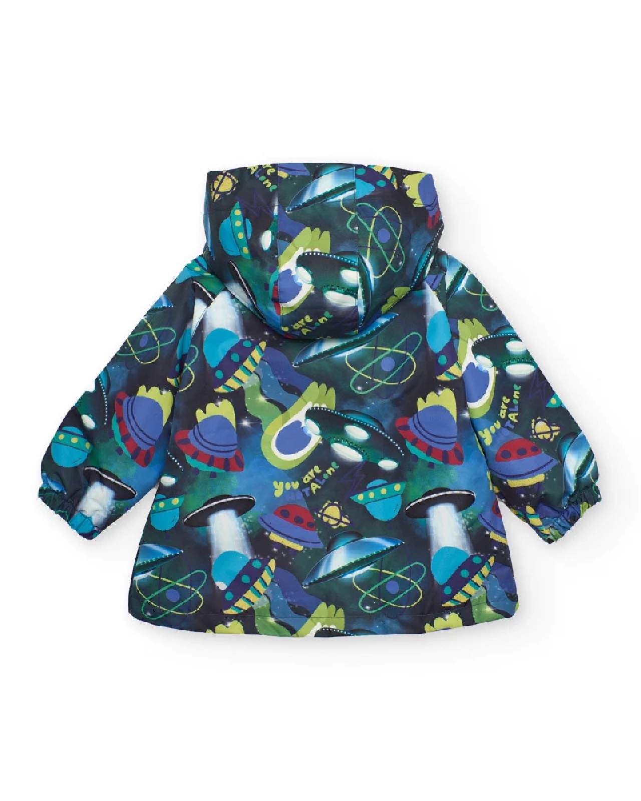 Giacca impermeabile per bambino decorata con stampa di navicelle spaziali e pianeti in toni vivaci. Cappuccio integrato, zip frontale a contrasto e ampie tasche frontali con patta. Polsini elastici per comfort e protezione.