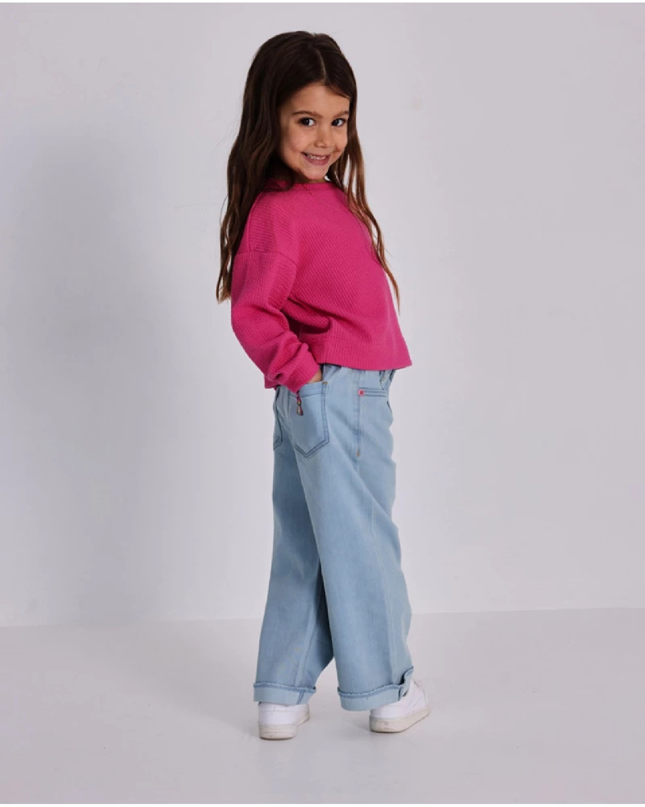Pantaloni in denim azzurro per bambina con elastico in vita, bottoni a pressione, tasche funzionali e ricamo di razzo sulla tasca posteriore. Orlo risvoltato.