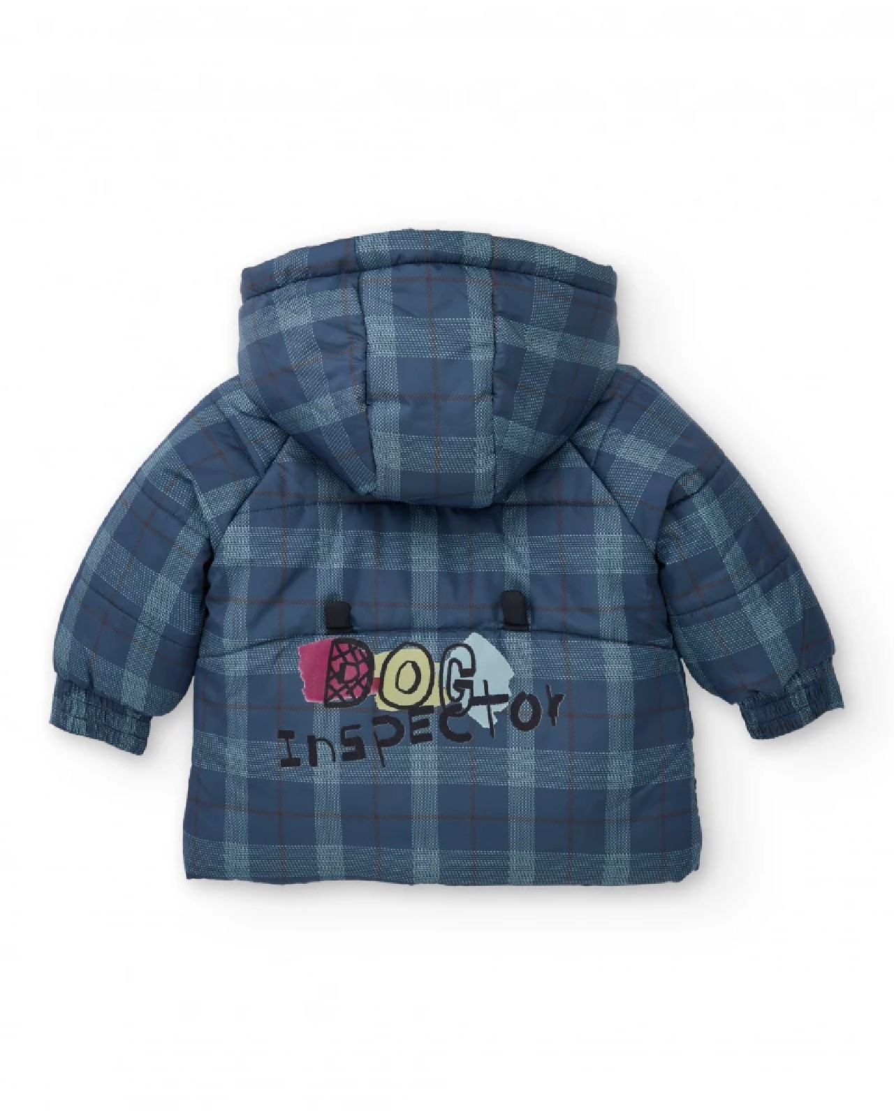 Parka imbottita da bambino in tessuto a quadri blu navy. Cappuccio foderato in contrasto, zip rossa e tasche laterali. Ricamo “DOG” sul davanti e grande scritta “DOG inspector” sul retro. Appartiene alla collezione dog inspector.