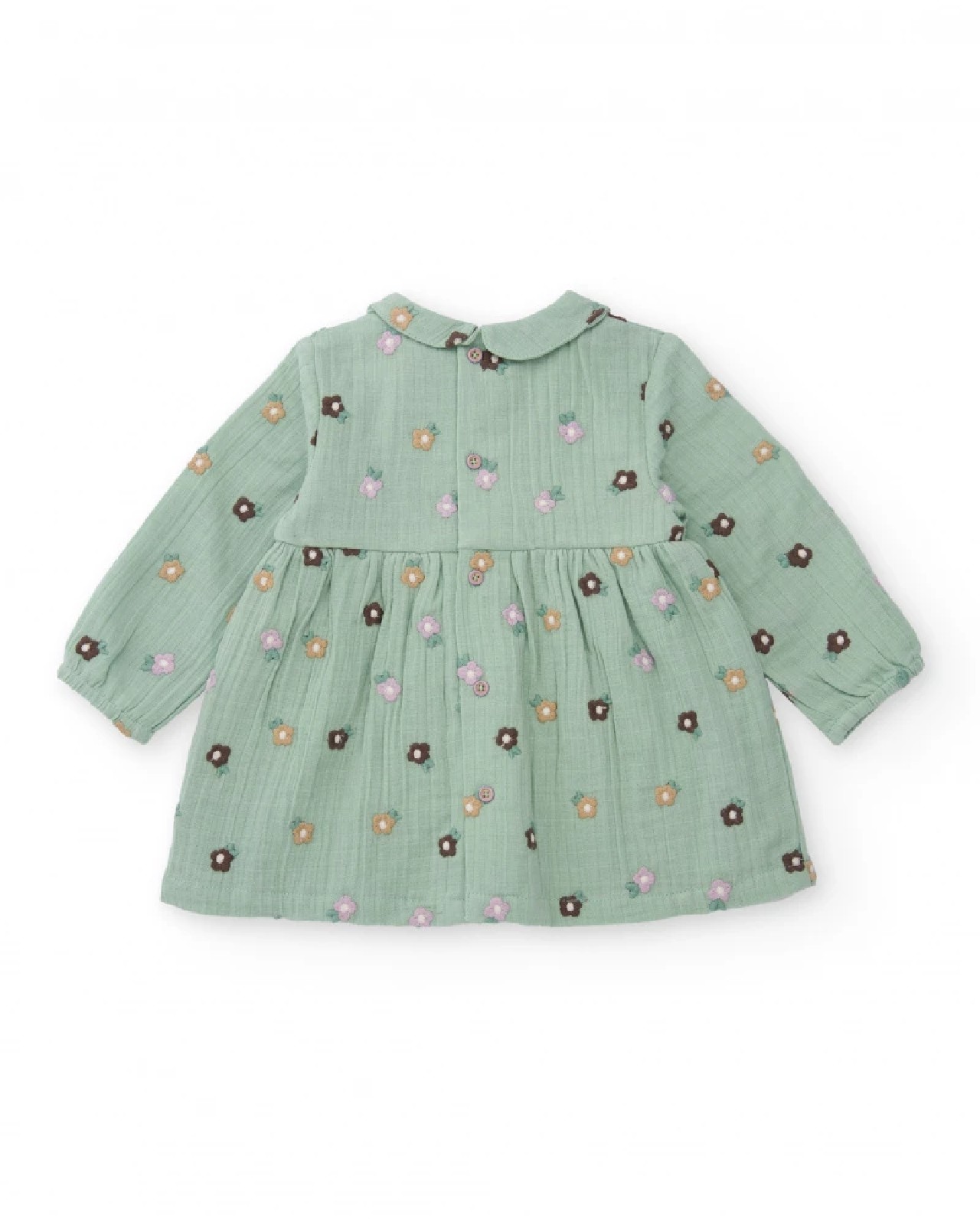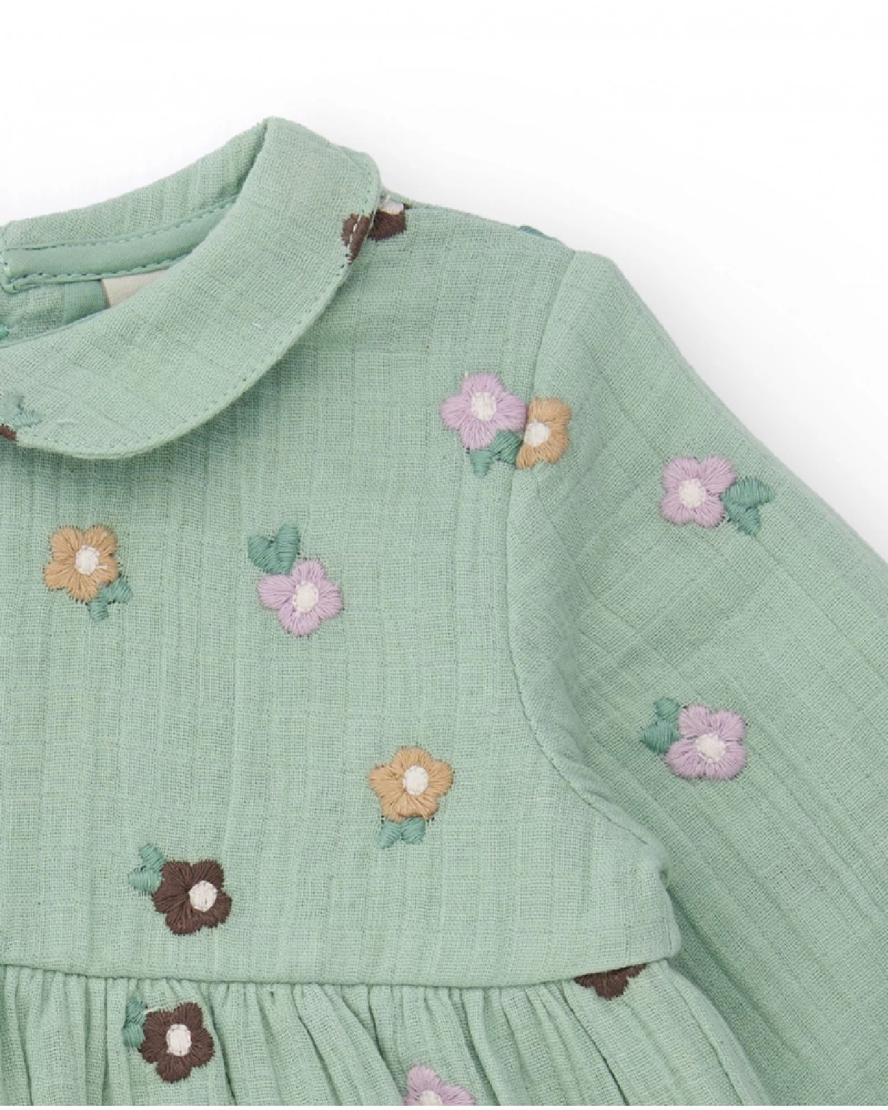 Vestito in chiffon per bambina in una delicata tonalità di verde con ricamo di piccoli fiori in colori pastello. Presenta un grazioso colletto alla Peter Pan e maniche lunghe per una maggiore copertura. La parte posteriore ha bottoni in legno per facilitare il cambio. Perfetto per occasioni speciali o per un look romantico e fresco.
