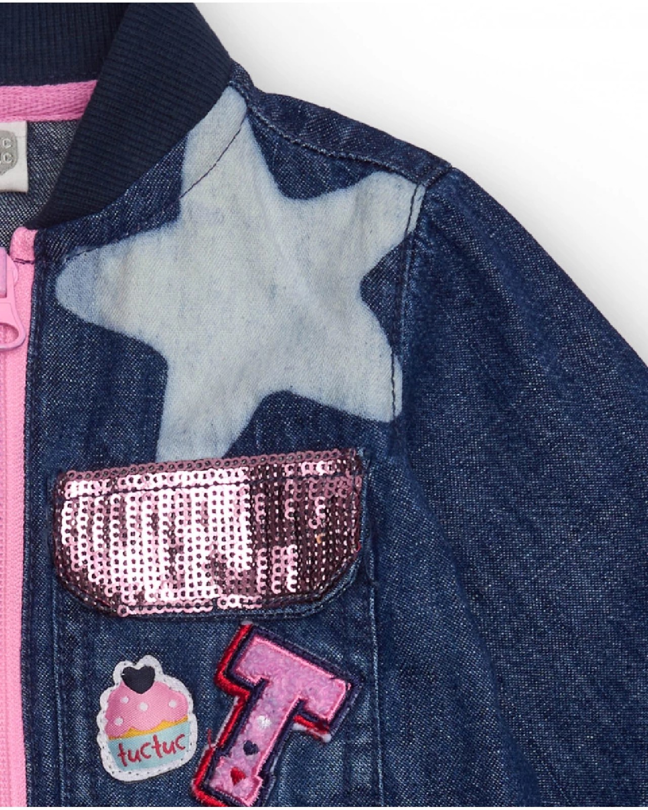 Vestito in denim leggero per bambina con zip frontale rosa. Parte superiore con applicazioni di stelle chiare, ricami e paillettes. Gonna in strati di tulle viola e fucsia per volume e movimento. Collo bomber e maniche lunghe con polsini elastici. Perfetto per occasioni speciali con un tocco casual.